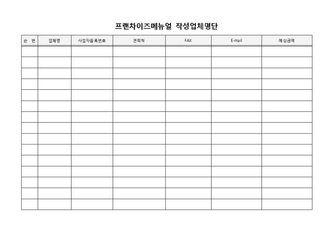 9,000원/월프랜차이즈메뉴얼 작성업체명단 입니다. 순번, 업체명, 사업자등록번호, 연락처, FAX, E-mail 등으로 구성되었습니다. 업체별 예상 견적 계산에 효과적입니다.