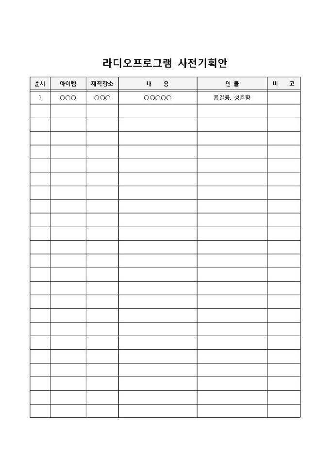 라디오 프로그램에 대한 전반적인 기획 내용을 사전에 기록할 때 사용되는 라디오 프로그램 사전 기획안 양식입니다. 순서, 아이템, 제작장소, 내용, 인물, 비고의 항목으로 구성되어 있습니다.