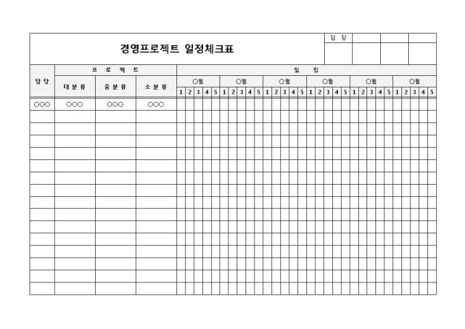 9,000원/월경영 프로젝트에 관한 시행 일정을 기록하고 체크할 때 사용되는 경영프로젝트 일정체크표 양식입니다. 담당, 프로젝트 분류, 일정 등의 항목으로 구성되어 있습니다.