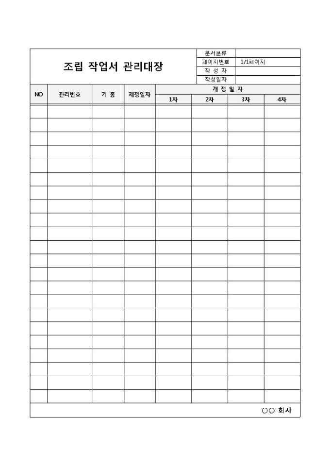9,000원/월조립 작업서의 제정일자 및 개정일자를 기록하거나 관리를 위해 사용되는 조립 작업서 관리대장 양식입니다. 관리번호, 기종, 제정일자, 개정일자 등의 항목으로 구성되어 있습니다.
