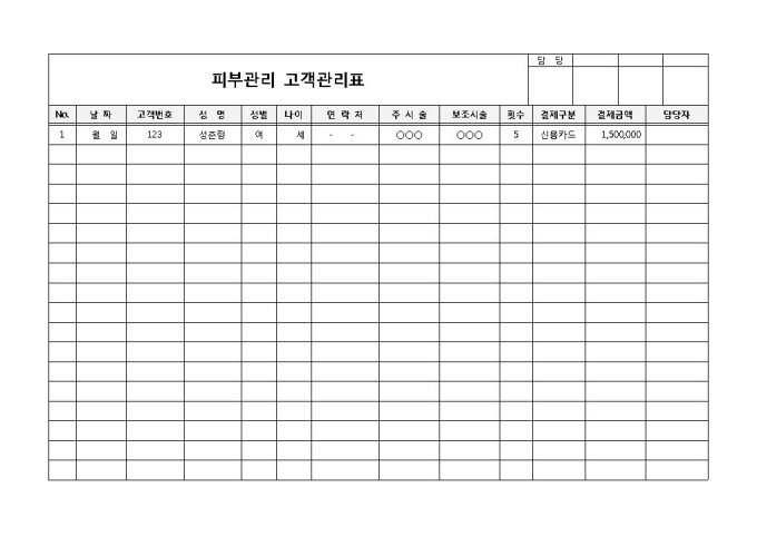 9,000원/월피부 관리를 받는 고객들을 대상으로 회사의 고객을 관리하고 관계를 유지하기 위하여 사용되는 피부관리 고객관리표 양식입니다. 날짜, 고객번호, 성명, 성별, 나이, 연락처, 주 시술, 보조 시술, 횟수, 결재구분, 결재금액, 확인자 등의 항목으로 구성되어 있습니다.