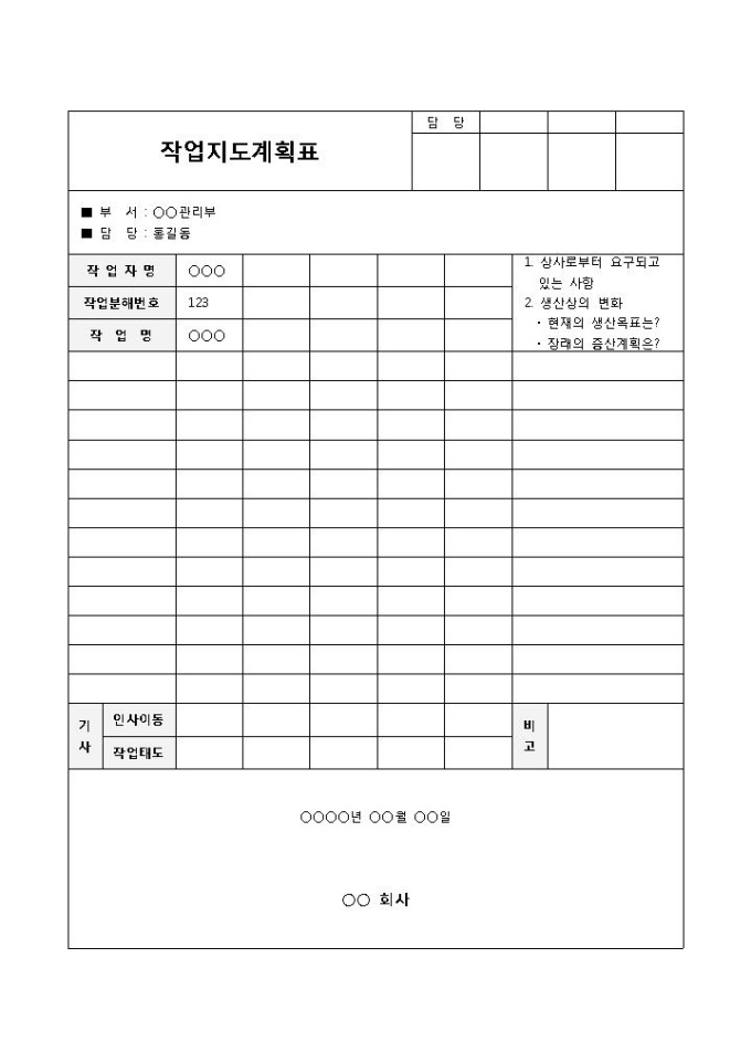 작업의 요구사항이나 생산상의 변화 등의 지도를 계획 세울 때 사용되는 작업 지도 계획표 양식입니다. 부서, 담당, 작업자명, 작업분해번호, 작업명, 인사이동, 작업태도 등의 항목으로 구성되어 있습니다.