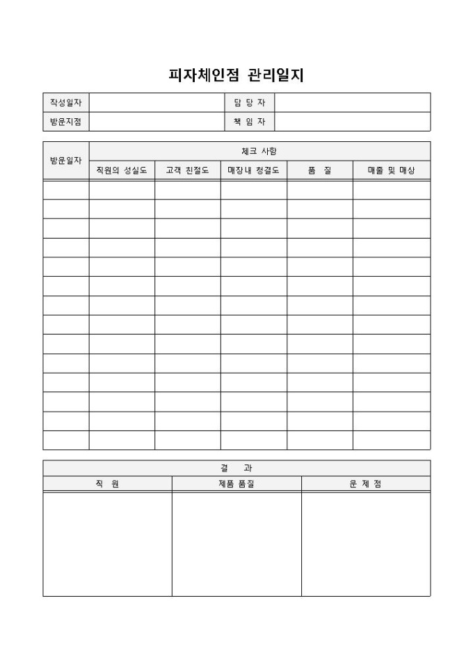 피자체인점 관리일지 입니다. 작성일자, 방문일자, 직원의 성실도, 고객 친절도, 매장내 청결도, 품질 등으로 구성되었습니다. 체인점의 문제사항 및 기타사항을 점검하고 그에 따른 평가 기술에 용이합니다.