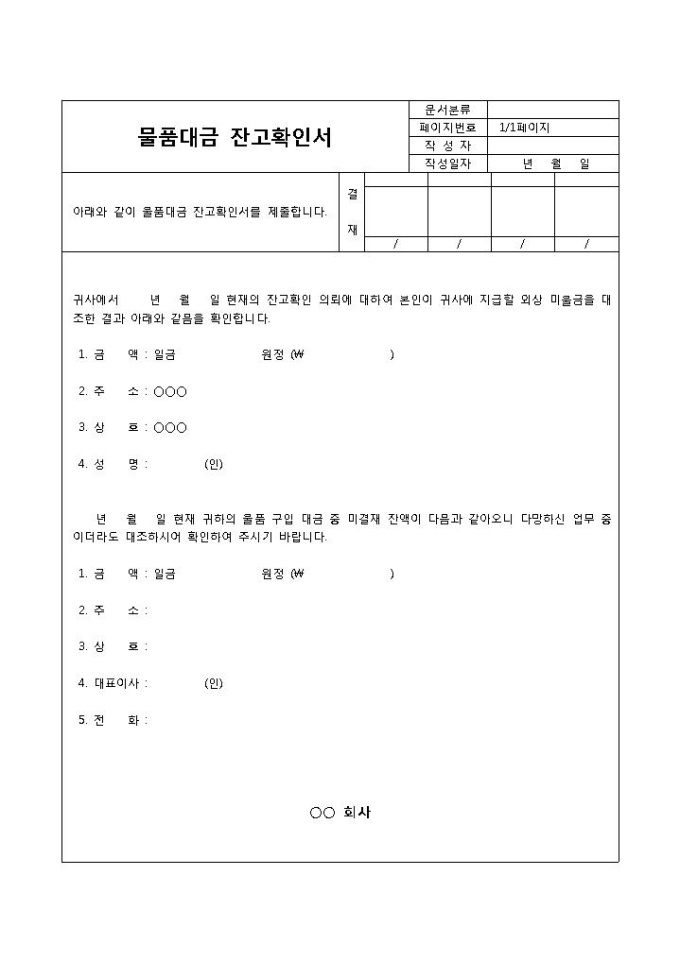 9,000원/월물품 대금의 잔고를 대조 및 확인을 위해 사용되는 물품 대금 잔고 확인서 양식입니다. 금액, 주소, 상호, 성명 등의 항목으로 구성되어 있습니다.