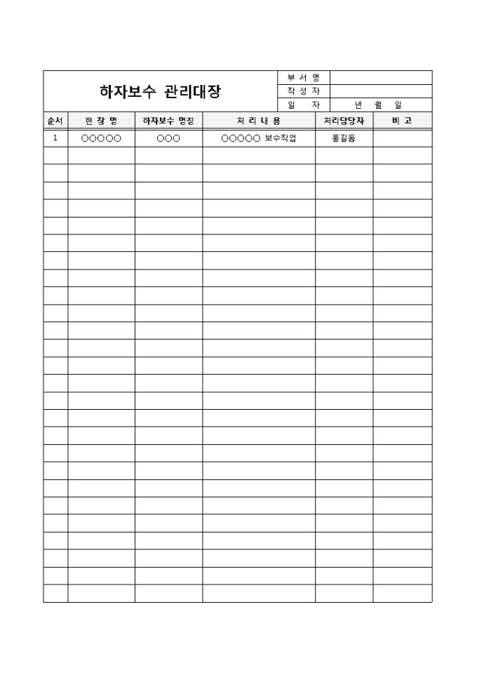 하자 보수에 관한 업무 정보를 기록하여 관리할 때 사용되는 하자보수 관리대장 양식입니다. 현장명, 하자보수 명칭, 처리내용, 처리담당자 등의 항목으로 구성되어 있습니다.