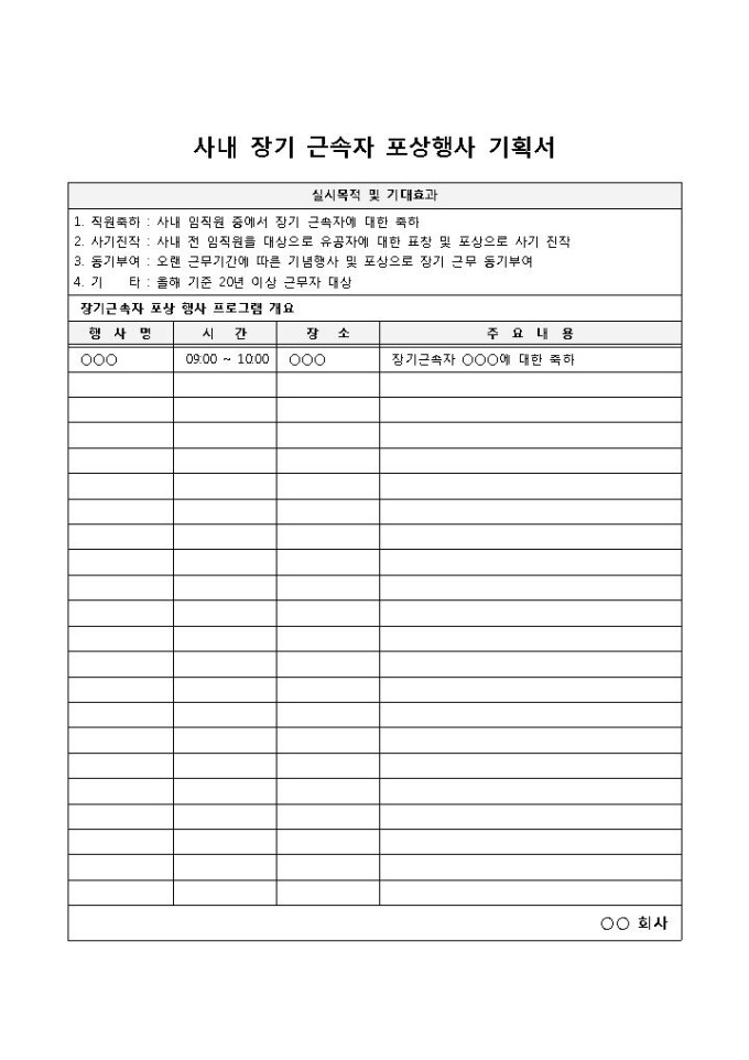 9,000원/월사내 임직원 중에서 장기 근속자에 대한 축하나 포상의 행사를 기획하고자 할 때 사용되는 사내 장기 근속자 포상행사 기획서 양식입니다.