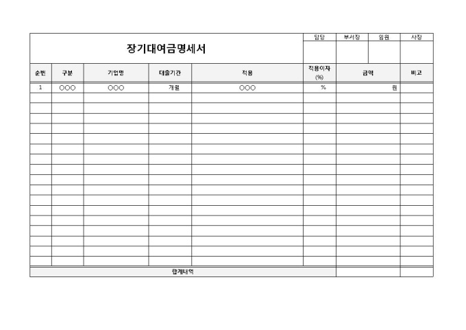 9,000원/월각 기업별로 대출에 대한 대출대여금을 효율적으로 관리할 때 사용하는 장기 대여금 명세서 양식입니다. 구분, 기업명, 대출기간, 적용, 적용이자, 금액 등의 항목으로 구성되어 있습니다.