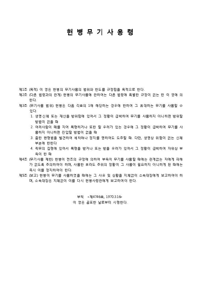 헌병무기사용령입니다. 헌병무기의 명령에 대한 내용으로 구성되어 있습니다. 헌병에 대한 무기 사용령을 작성할 때 사용할 수 있습니다.