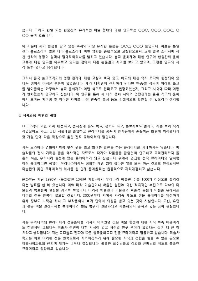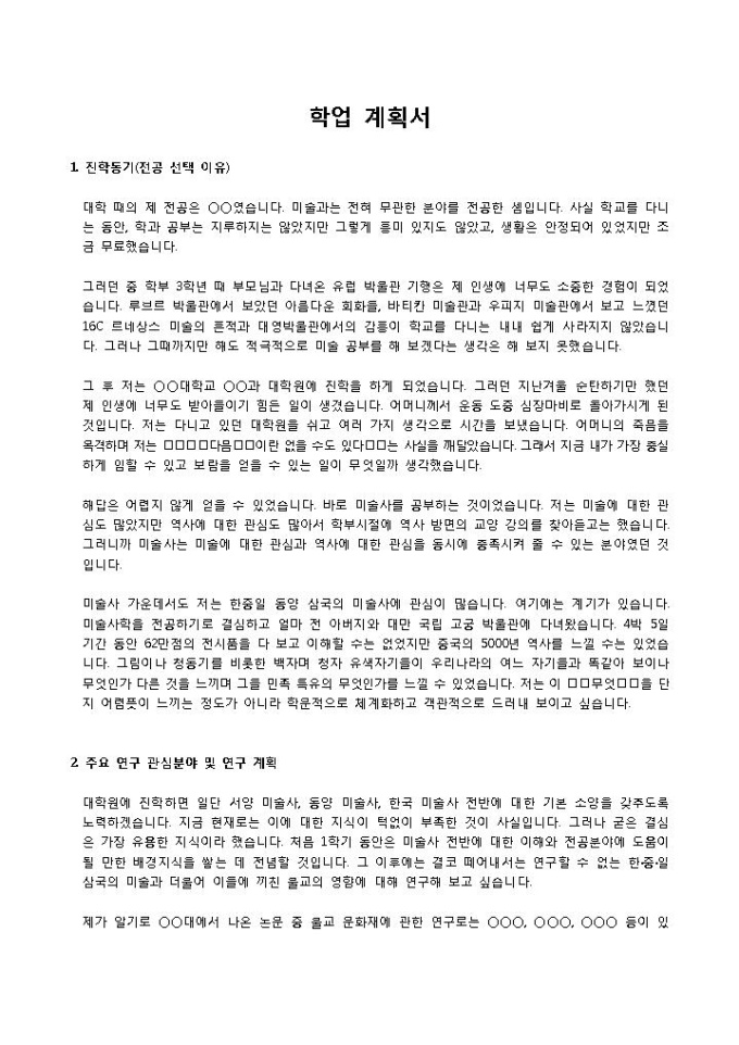 9,000원/월대학생활에 대한 당사자의 기본 설계가 잘 나타나야 하며, 특히 지망하는 학과의 학문분야를 어느 정도 이해하고 있으며, 강의를 들을 준비가 되어있는지, 해당 분야에 대한 안목이 어느 정도인지를 파악할 수 있는 자료인 학업계획서 양식입니다. 진학동기(전공선택이유), 주요 연구 관심분야 및 연구계획, 석사과정 이후의 계획의 항목으로 구성되어 있습니다.