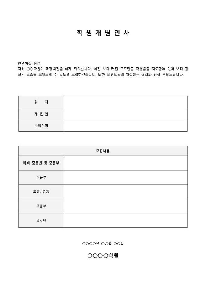 9,000원/월학원개원인사 홍보글 입니다. 위치, 개원일, 문의전화, 초등부, 중등부 등으로 구성되었습니다. 각 학년에 따른 수업방식 및 수업료 명시에 용이합니다.