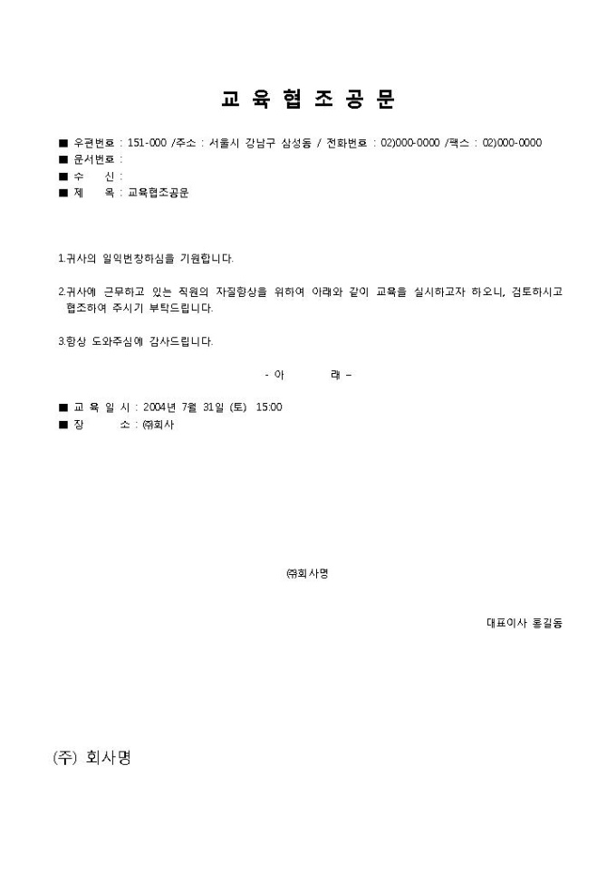 9,000원/월교육협조 공문입니다. 제목, 협조 내용, 교육 일시, 장소 등으로 구성되어 있습니다. 교육에 대한 협조를 공고할 때 사용할 수 있습니다.