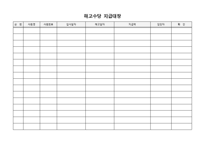 9,000원/월해고수당 지급대장 입니다. 사원명, 사원번호, 입사일자, 해고일자, 지급액, 담당자 등으로 구성되었습니다. 확인란을 통해 해고수당 수령내역 확인에 용이합니다.