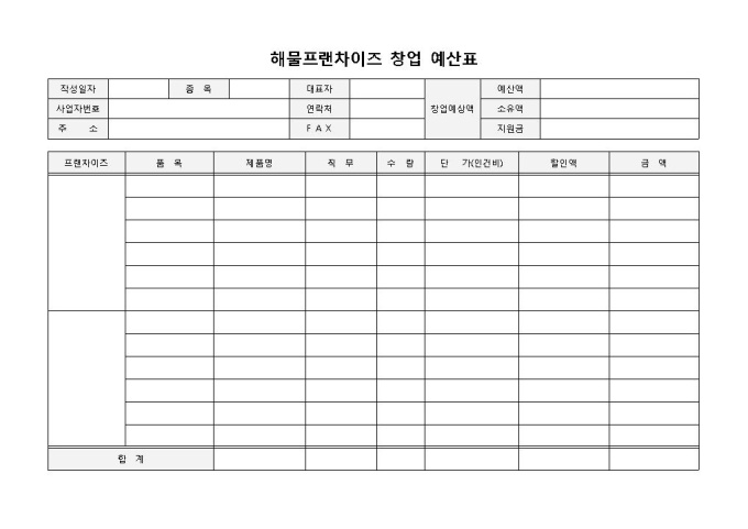 9,000원/월해물프랜차이즈 창업 예산표 입니다. 프랜차이즈명, 품목, 품명, 직무 등으로 구성되었습니다. 각 품명에 따른 단가 및 수량에 따른 예상액 파악에 용이한 양식입니다.
