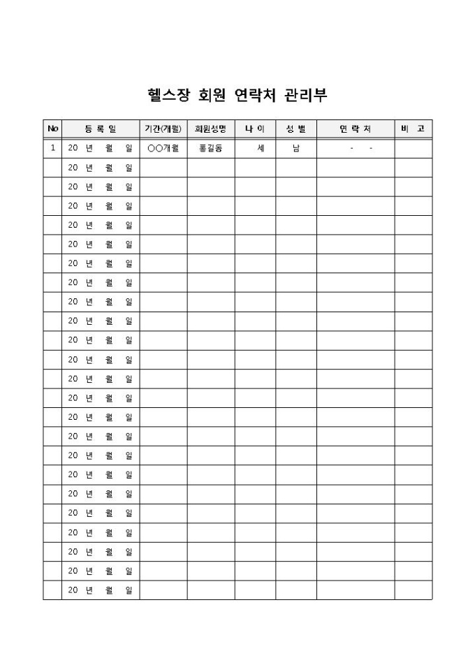 헬스장 회원들의 연락처를 기록하고 관리하기 위해 사용되는 헬스장 회원 연락처 관리부 양식입니다. 등록일, 기간(개월), 회원성명, 나이, 성별, 연락처, 비고의 항목으로 구성되어 있습니다.