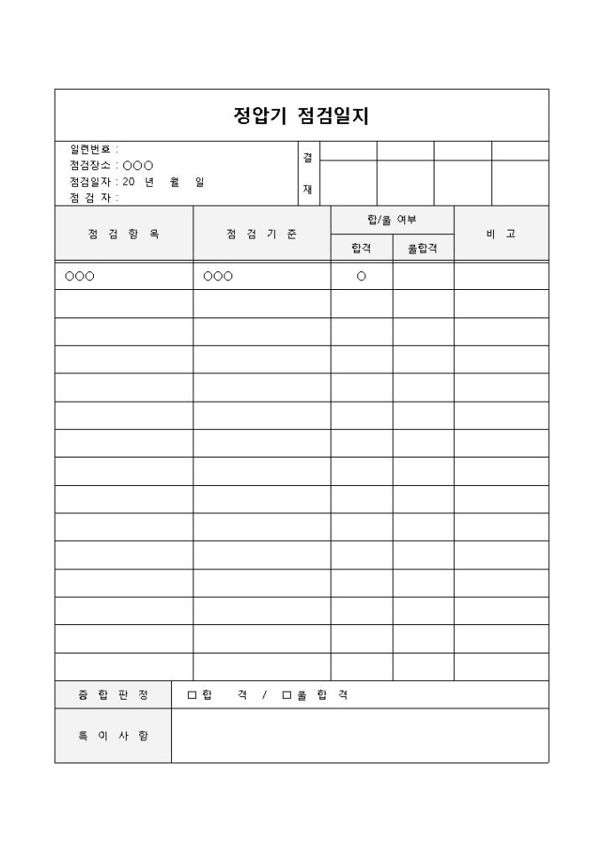 9,000원/월정압기를 점검 기준에 따라 점검 항목별로 합격, 불합격의 여부를 기록하고 종합적으로 판정하고 관리할 때 사용되는 정압기 점검일지 양식입니다. 일련번호, 점검장소, 점검일자, 점검자, 점검항목, 기준, 합격 및 불합격의 여부 등의 항목으로 구성되어 있습니다.