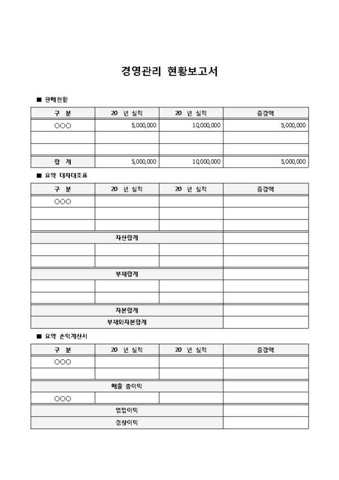 9,000원/월회사의 경영 관리에 대한 현황을 통계하고 보고할 때 사용되는 경영관리 현황보고서 양식입니다. 판매현황, 실적, 증감액, 대차대조표, 손익계산서 등의 항목으로 구성되어 있습니다.