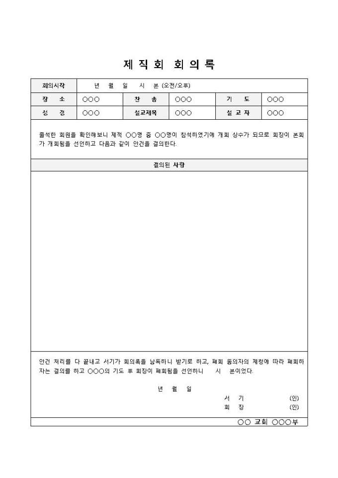 9,000원/월제직회의 개회됨을 선언하고 안건을 결의할 때 사용되는 제직회 회의록 양식입니다. 회의시작일시, 장소, 찬송, 기도, 성경, 설교제목, 설교자, 결의된 사항 등의 항목으로 구성되어 있습니다.