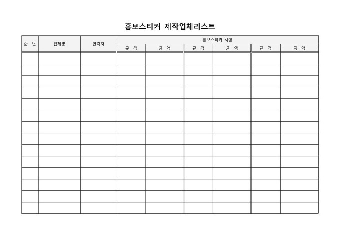 9,000원/월홍보스티커 제작업체리스트 입니다. 순번, 업체명, 연락처, 홍보스티커 사항 등으로 구성되었습니다. 스티커의 규격에 따른 금액 파악에 용이합니다.