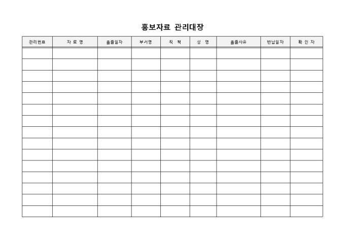 9,000원/월홍보자료 관리대장 입니다. 관리번호, 자료명, 작성부서, 직책, 성명, 반납일자 등으로 구성되었습니다. 자료별 불출 사유 및 담당자 확인에 용이한 양식입니다.