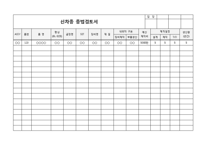 9,000원/월예산제작비, 제작일정, 생산량 등을 고려하고 신차종의 종법을 검토할 때 사용되는 신차종 종법검토서 양식입니다. ASSY, 품명, 형상, 공정명, 장비명, 재질, 내외작 구분, 예산제작비, 제작일정, 생산량 등의 항목으로 구성되어 있습니다.