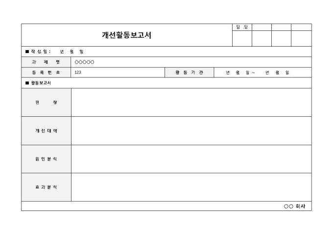 과제명, 등록번호, 활동기간 등을 기록하여 개선 활동 결과를 보고하는 내용의 개선활동 보고서(등록번호) 양식입니다. 작성일, 과제명, 등록번호, 활동기간, 현상, 개선대책, 원인분석 등의 항목으로 구성되어 있습니다.