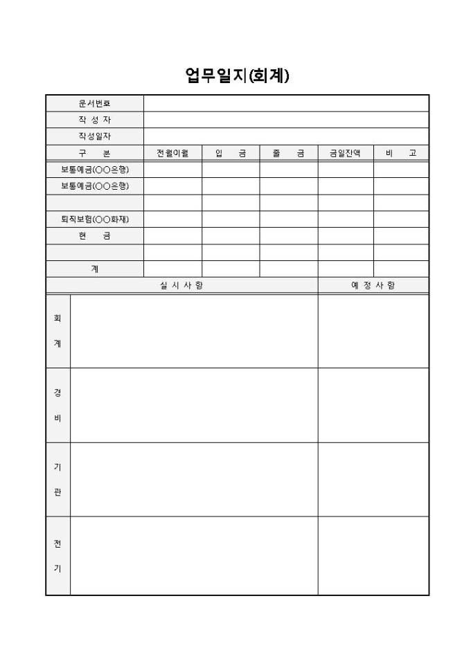 업무일지(회계)입니다. 문서번호, 작성자, 작성일자, 구분, 전월이월, 입금, 출금, 금일잔액, 비고 등으로 구성되어 있습니다. 기업의 회계부서에서 업무에 대한 일지로 작성하여 사용할 수 있습니다.