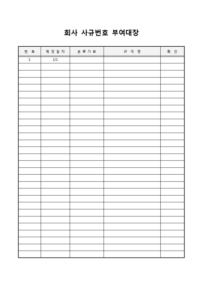 회사 사규번호 부여대장입니다. 번호, 제정일자, 분류기호, 규격명, 확인으로 구성되어 있습니다. 사내에 대한 사규 번호를 부여하고 이에 대한 대장을 작성할 때 사용할 수 있습니다.