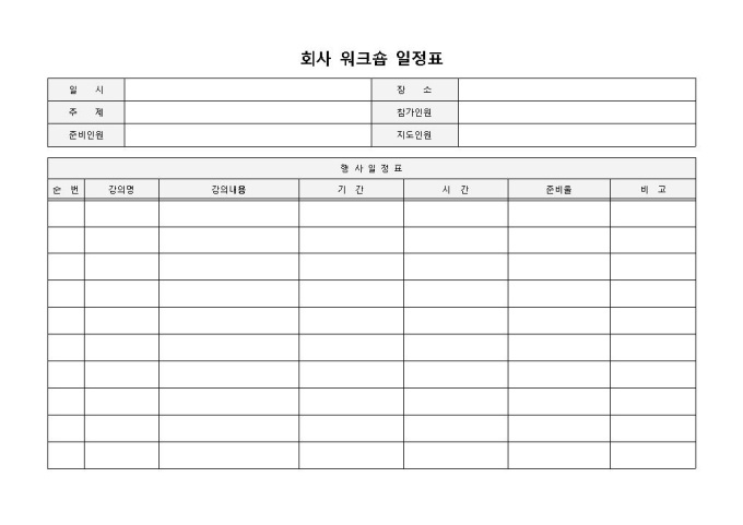 9,000원/월회사워크숍 일정표 입니다. 일시, 주제, 준비인원, 장소, 참가인원, 지도인원, 순번, 강의명, 강의내용 등으로 구성되었습니다. 기간에 따른 워크숍 일정 및 강의사항 파악에 용이합니다.