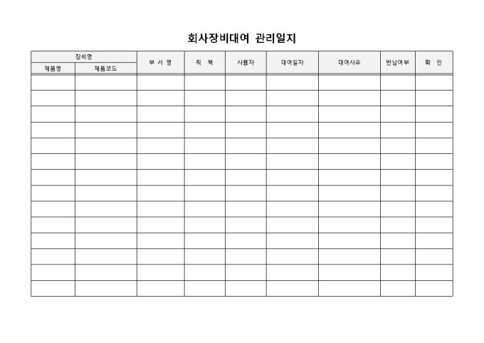9,000원/월회사장비대여 관리일지 입니다. 장비명, 부서명, 직책, 사용자, 대여일자, 대여사유, 반납여부 등으로 구성 되었습니다. 장비별 대여사유를 작성할 수 있습니다. 대여장비의 반납여부를 관리하는데 용이합니다.