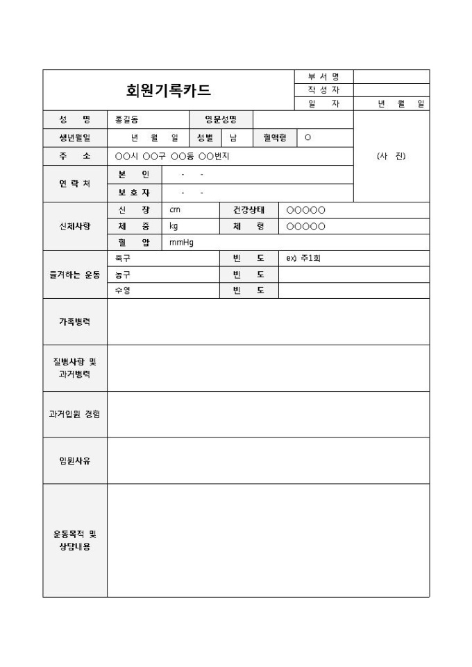 해당 회원에 관하여 여러 인적사항 및 운동목적, 상담내용 등을 기록하고 관리할 때 사용되는 회원기록카드 양식입니다. 회원의 인적사항, 즐겨하는 운동, 가족병력, 질병사항 및 과거병력, 입원경험, 운동목적, 상담내용 등의 항목으로 구성되어 있습니다.