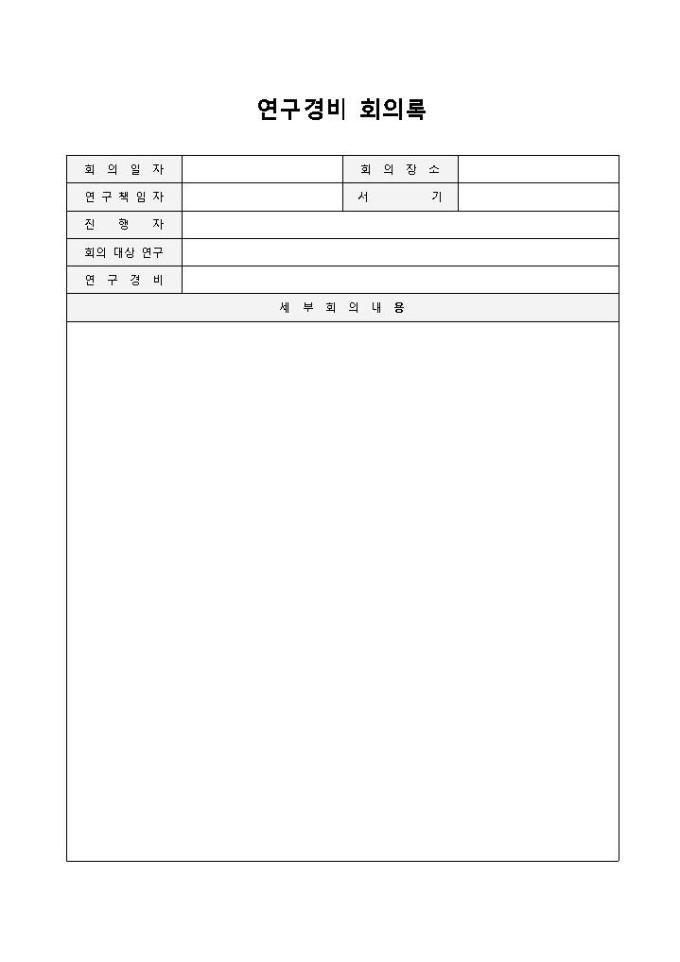 9,000원/월연구경비 회의록입니다. 회의일자, 회의장소, 연구책임자, 서기, 진행자, 회의 대상 연구, 연구경비, 세부 회의 내용 등으로 구성되어 있습니다. 기업에서 연구에 대한 경비를 계산하고 이에 대한 회의를 할 때 작성하여 사용할 수 있습니다.