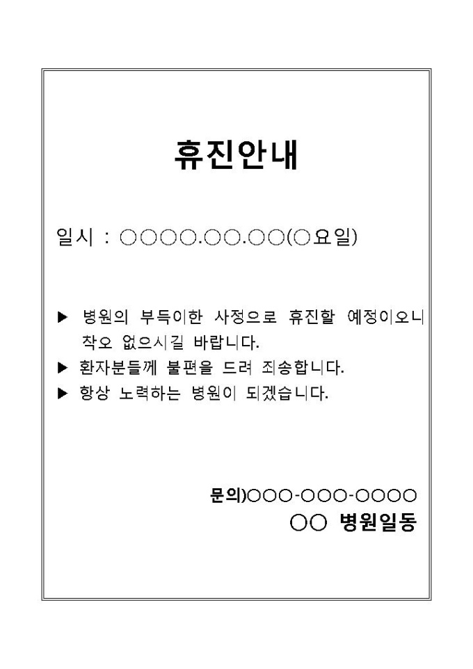 병원의 부득이한 사정으로 휴진을 한다는 내용의 휴진 안내문 양식입니다.