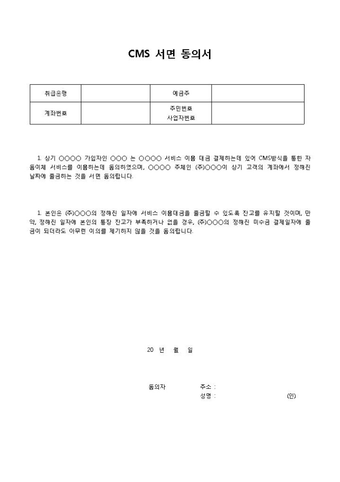 9,000원/월CMS동의서(서면)입니다. 취급은행, 예금주, 계좌번호, 주민번호 등의 항목으로 구성되어 있습니다. 기본적인 CMS동의서 양식입니다.