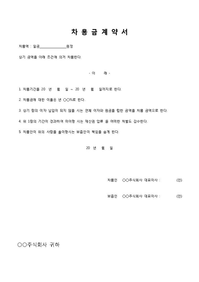 차용금계약서입니다. 차용액, 차용기간, 처벌 항목 등으로 구성되어 있습니다. 차용금에 대한 계약을 할 때 사용할 수 있습니다.