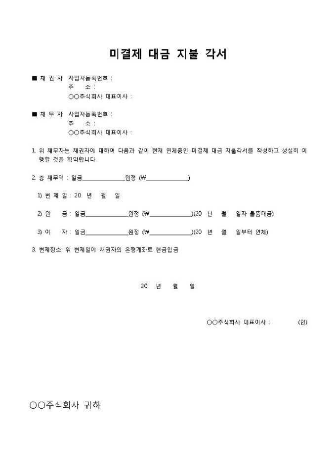 9,000원/월미결제 대금 지불 각서입니다. 채권자, 채무자, 대금 지불 각서 내용으로 구성되어 있습니다. 미결제 대금 지불에 대한 각서를 작성할 때 사용할 수 있습니다.