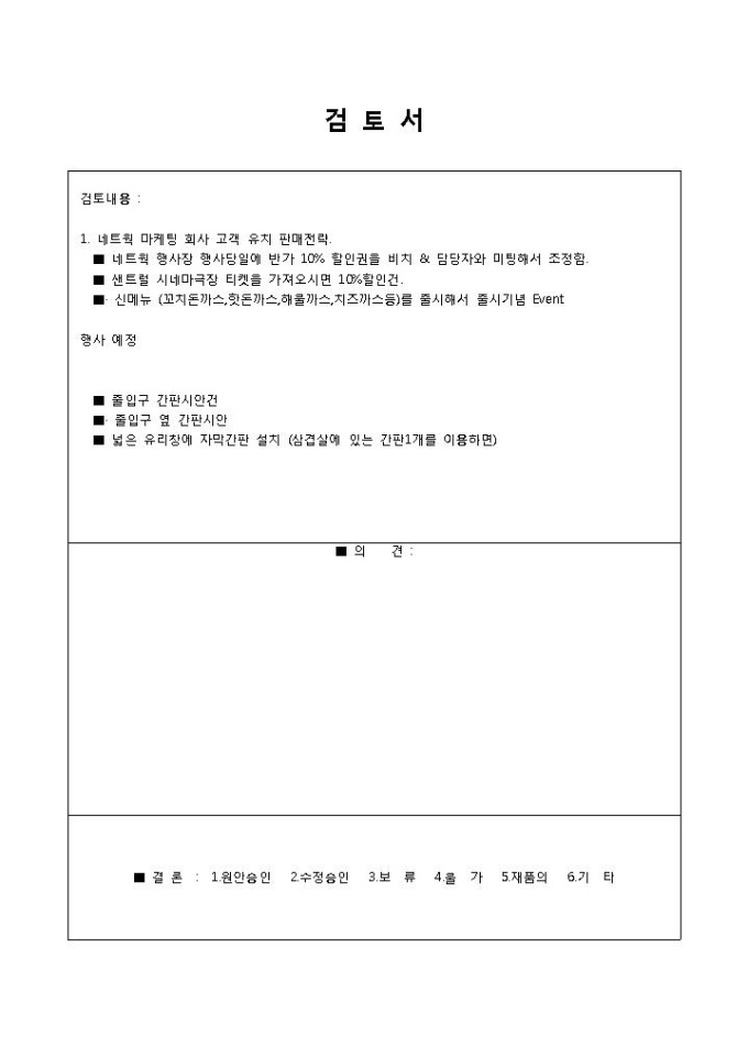 9,000원/월음식점 고객 유치 판매전략 검토서입니다. 검토내용과 행사 예정, 의견으로 구성되어 있습니다. 고객들을 유치하기 위한 전략에 대해 설명되어 있습니다.