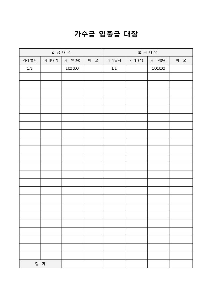 9,000원/월가수금 입출금대장입니다. 입금내역, 출금내역 등으로 구성되어 있습니다. 가수금에 대한 입출금을 기록하고자 할 때 사용할 수 있습니다.
