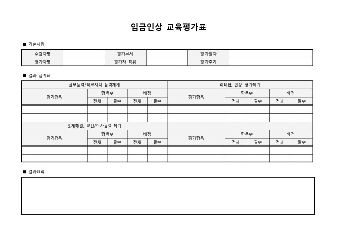 9,000원/월임금인상 교육평가표입니다. 수검자명, 평가부서, 평가일자, 평가자명, 평가자 직위, 평가주기 등으로 구성되어 있습니다. 기업내에서 임금인상의 교육평가표로 작성하여 사용할 수 있습니다.