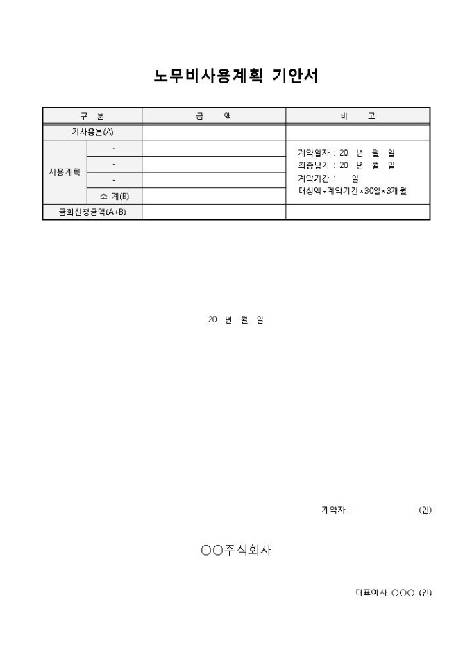 9,000원/월노무비사용계획 기안서입니다. 구분, 금액, 비고, 기사용분, 사용계획, 금회신청금액 등으로 구성되어 있습니다. 기업에서 노무비에 대한 사용계획서를 작성할 때 사용할 수 있습니다.