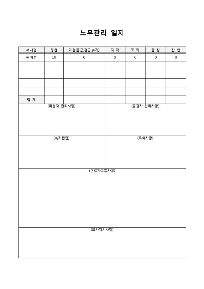 노무관리 일지입니다. 부서명, 정원, 미결, 지각, 조퇴, 출장, 잔업 등으로 구성되어 있습니다. 기업에서 근로자에 대한 관리 일지로 작성하여 사용할 수 있습니다.