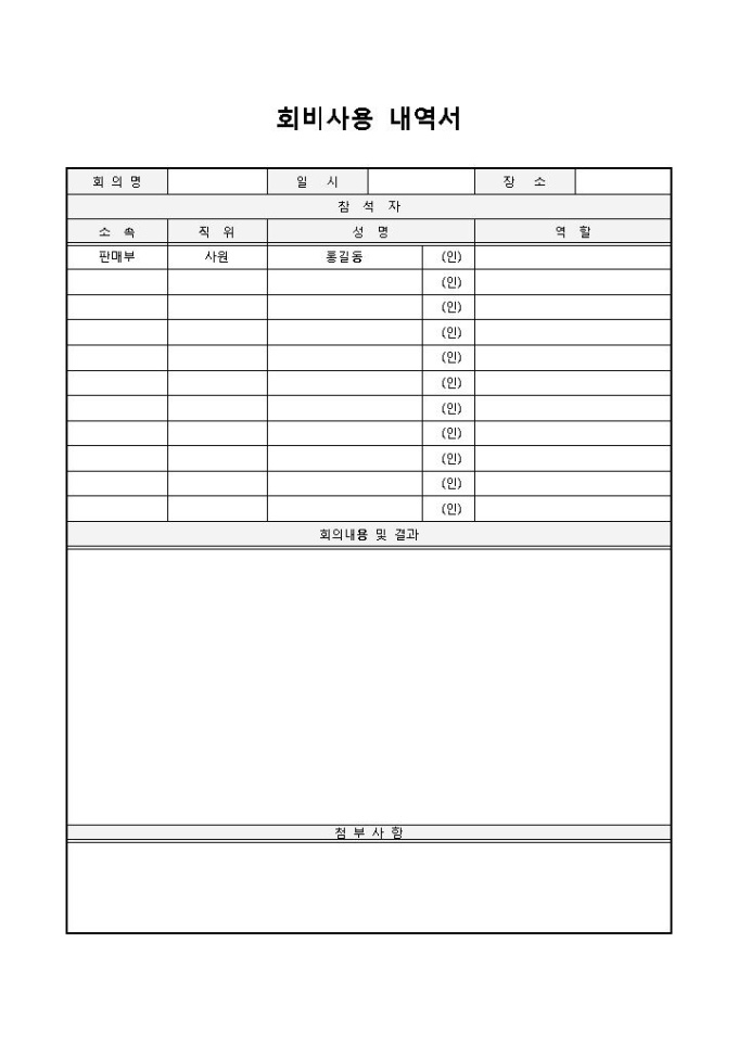 회비사용 내역서입니다. 회의명, 일시, 장소, 참석자, 소속, 직위, 성명, 역할 등으로 구성되어 있습니다. 기업에서 회비의 사용에 대한 내역서를 작성할 때 사용할 수 있습니다.