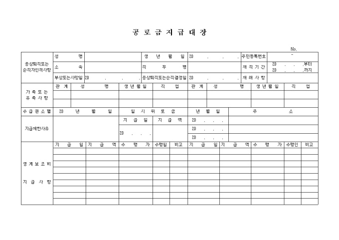인적사항, 유족사항, 지급제한사유, 생계보조비 지급사항 등을 기록하는 공로금지급대장입니다.