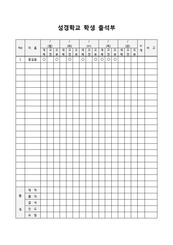 성경학교 학생 출석부입니다. 순서, 이름, 요일별, 누계 등으로 구성되어 있습니다. 성경학교에서 학생의 관리와 출석 현황을 작성할 때 사용할 수 있습니다.