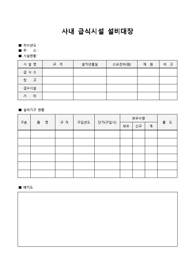 사내 급식시설 설비대장입니다. 착수년도, 주소, 시설현황, 설비기구 현황, 배치도 등으로 구성되어 있습니다. 기업내의 급식시설에 대한 설비대장으로 작성할 때 사용할 수 있습니다.