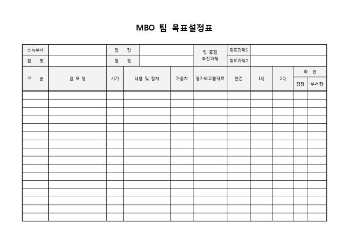 9,000원/월MBO 탐 목표 설정표입니다. 소속부서, 팀장, 팀명, 팀원, 팀 중점 추진과제 등으로 구성되어 있습니다. 기업의 MOB팀의 목표설정표를 작성할 때 사용할 수 있습니다.