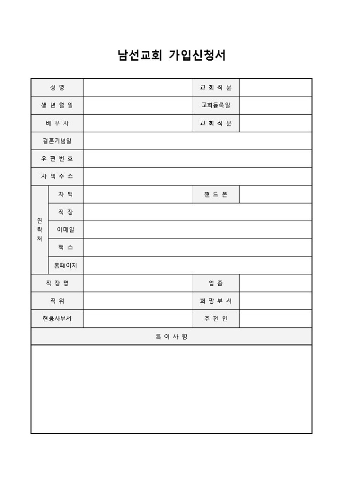 9,000원/월남선교회 가입신청서입니다. 성명, 교회직분, 생년월일, 교회등록일, 배우자, 교회 직분 등으로 구성되어 있습니다. 남선교회에 대한 가입 선청서를 작성할 때 사용할 수 있습니다.