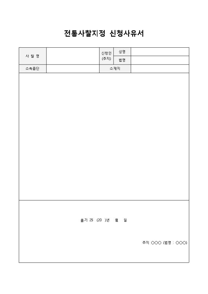 전통사찰지정 신청사유서입니다. 사찰명, 신청인, 소속종단, 소재지 등으로 구성되어 있습니다. 사찰을 전통사찰로 지정하고 이에 대한 신청사유서로 작성할 때 사용할 수 있습니다.