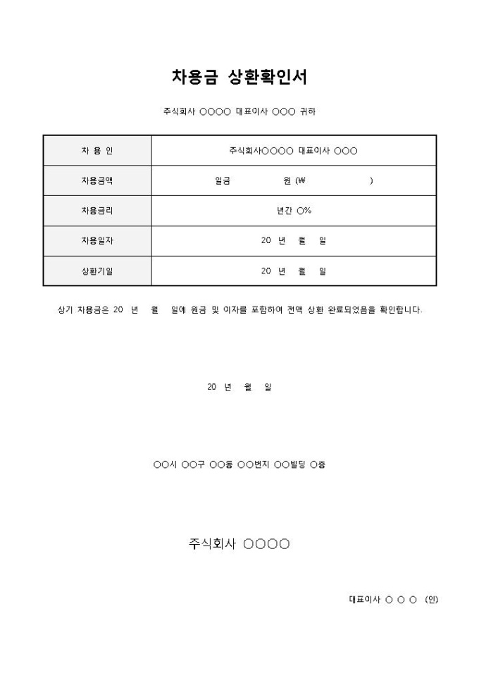 9,000원/월차용금 상환확인서입니다. 차용인, 차용금액, 차용금리, 차용일자, 상환기일 등으로 구성되어 있습니다. 차용금의 원금 및 이자를 포함하여 전액을 상황을 완료하였을 때 확인서로 작성하여 사용할 수 있습니다.