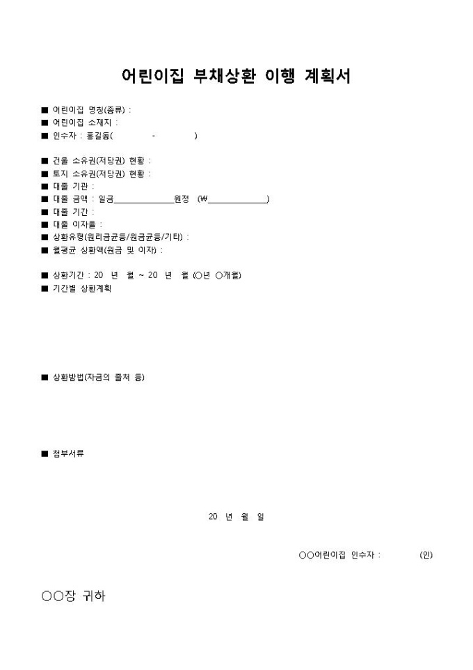 9,000원/월부채상환 이행계획서(어린이집)입니다. 어린이집 명칭, 건물 소유권, 토지 소유권, 대출 기관, 상환 기간 등으로 구성되어 있습니다. 어린이집에 대한 부채상환을 이행한다는 계획할 때 사용할 수 있습니다.