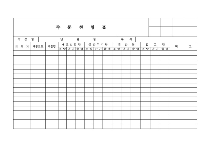 9,000원/월주문현황표 양식입니다. 의뢰처별 제조의뢰량, 생산지시량, 생산량, 입고량등의 세부항목으로 구성된 현황표 양식입니다.